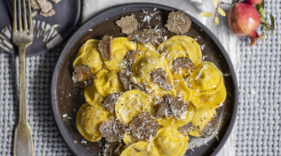 La pasta fatta in casa è farcita con un ripieno a base di pane e condita con burro e tartufo. Un profumo inebriante per un piatto gourmet che riempie e soddisfa il palato