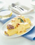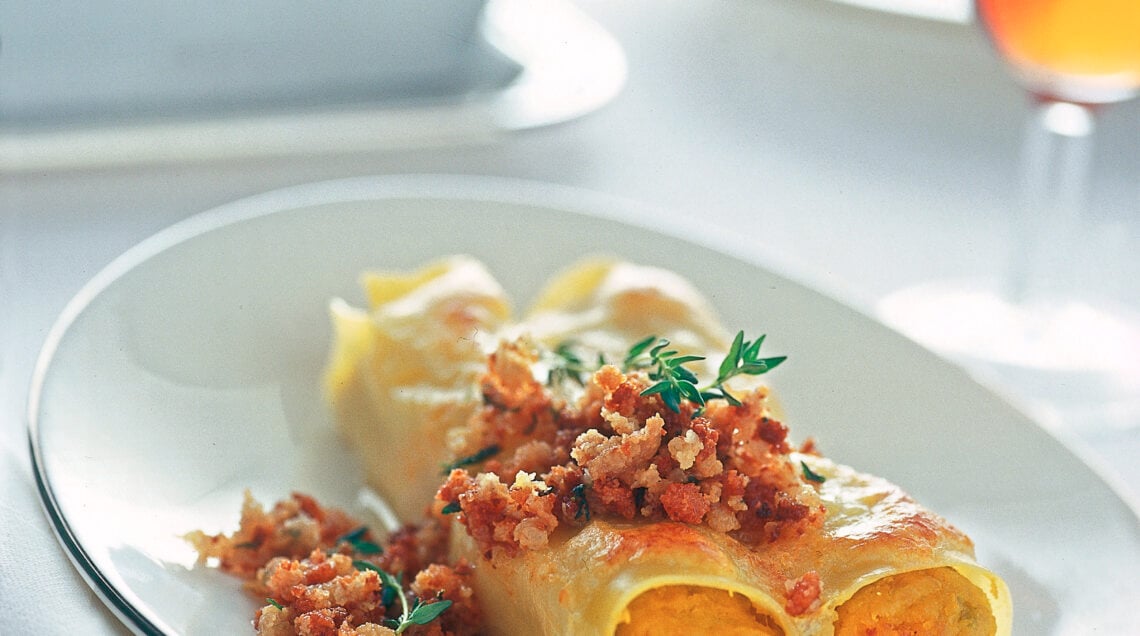 4 Poco prima del termine della cottura, tritate il lardo con il timo, fate rosolare il mix in un tegame, aggiungete l'amaretto sbriciolato e lasciate dorare. Servite i cannelloni con il condimento preparato, ben caldo.