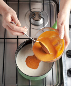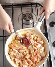 Prelevate le teste e il carapace dei gamberoni (tenendo da parte questi ultimi per il ripieno), rosolatele in padella con 60 g di burro, sfumate con il brandy e poi con il vino. Unite il concentrato di pomodoro, salate e cuocete per 5 minuti mescolando. Passate la preparazione al setaccio, schiacciando i gusci con il dorso di un cucchiaio per recuperare più liquido possibile.
