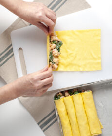 Farcite le sfoglie di pasta con il ripieno e arrotolatele. Allineate i rotoli in una teglia imburrata, versatevi sopra il resto della salsa e gratinate sotto il grill per 10 minuti. Tostate il pangrattato con il prezzemolo e un filo di olio. Spolverizzatelo sulla pasta e servite decorando con i gamberi tenuti da parte.