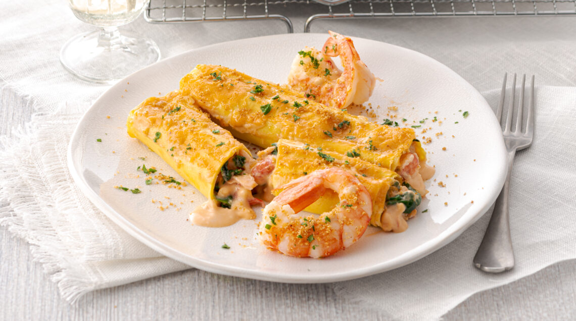 Pasta fresca farcita con salmone e spinaci e conditi con una salsa a base di besciamella e sughetto di gamberoni. Gratinati in forno, si preparano anche in anticipo