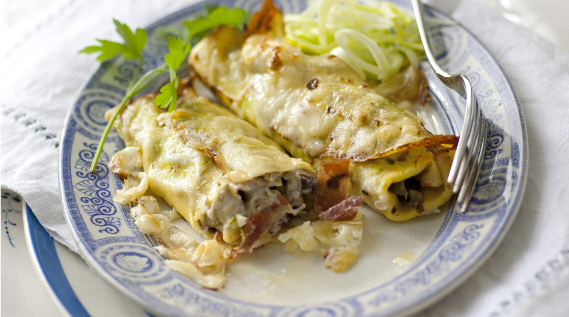 4 Spalmate un velo di besciamella ai funghi sulle crespelle coprite con il culatello a listarelle, i funghi rimasti e avvolgete ciascuna su se stessa formando dei cannelloni. Allineateli man mano in una pirofila ben imburrata, copriteli con la besciamella ai funghi rimasta e spolverizzateli con il restante l'emmentaler. Mettete in forno caldo a 220° per 15 minuti, finché saranno dorati in superficie.