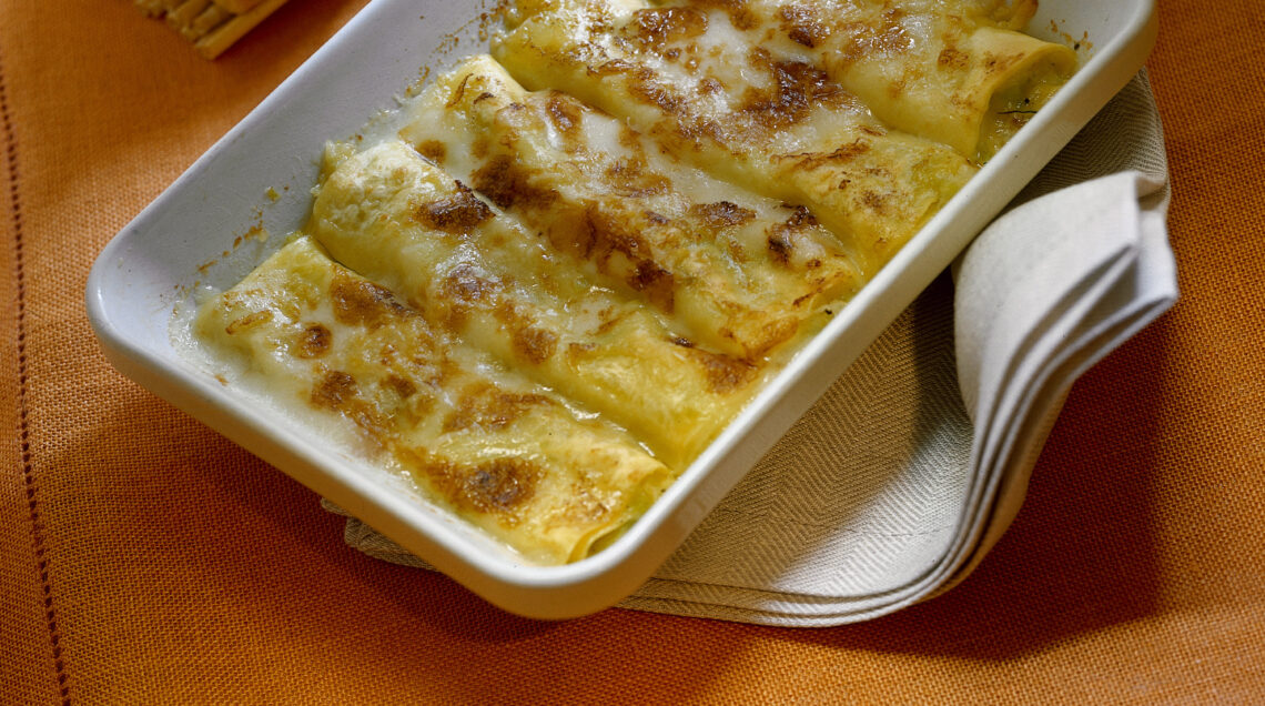 2 Togliete la crosta al taleggio, spezzettatelo, mettetelo in una ciotola e bagnatelo con la panna. Lessate i cannelloni in acqua bollente salata a cui avrete aggiunto un cucchiaio di olio per evitare che la pasta si attacchi.