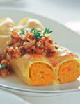 4 Sgocciolate i cannelloni al dente, farciteli con il composto di porri e sistemateli, uno accanto all'altro, in una teglia imburrata, senza sovrapporli. Cospargeteli con il taleggio rimasto e qualche fogliolina di salvia, spolverizzateli con il formaggio grattugiato, aggiungete qualche fiocchetto di burro e fate gratinare in forno caldo finché la superficie inizia a dorare.
