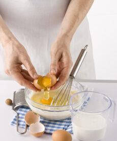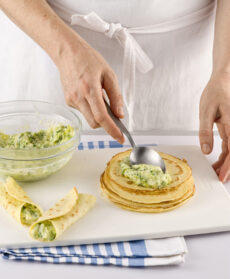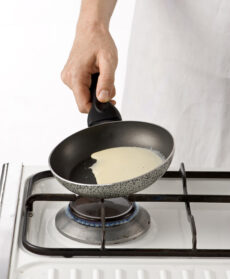 Intanto scaldate bene una padellina di 15 cm di diametro imburrata, versatevi un mestolino di pastella, allargatela uniformemente sul fondo della padellina. Appena il fondo è leggermente rappreso, giratelo delicatamente con una paletta e cuocete l’altro lato. Cuocete altre crespelle fino a esaurire la pastella.