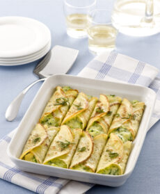 Questo primo piatto è preparato con crespelle farcite di verdure e condite con besciamella e grana; arrotolate diventano sfiziosi cannelloni da servire preferibilmente caldi, appena tirati furi dal forno, oppure tiepidi per un brunch. Le crespelle sono fatte in casa con la pastella classica a base di uova, farina, latte e burro, come anche la besciamella, che potete insaporire con un po' di parmigiano o pecorino.