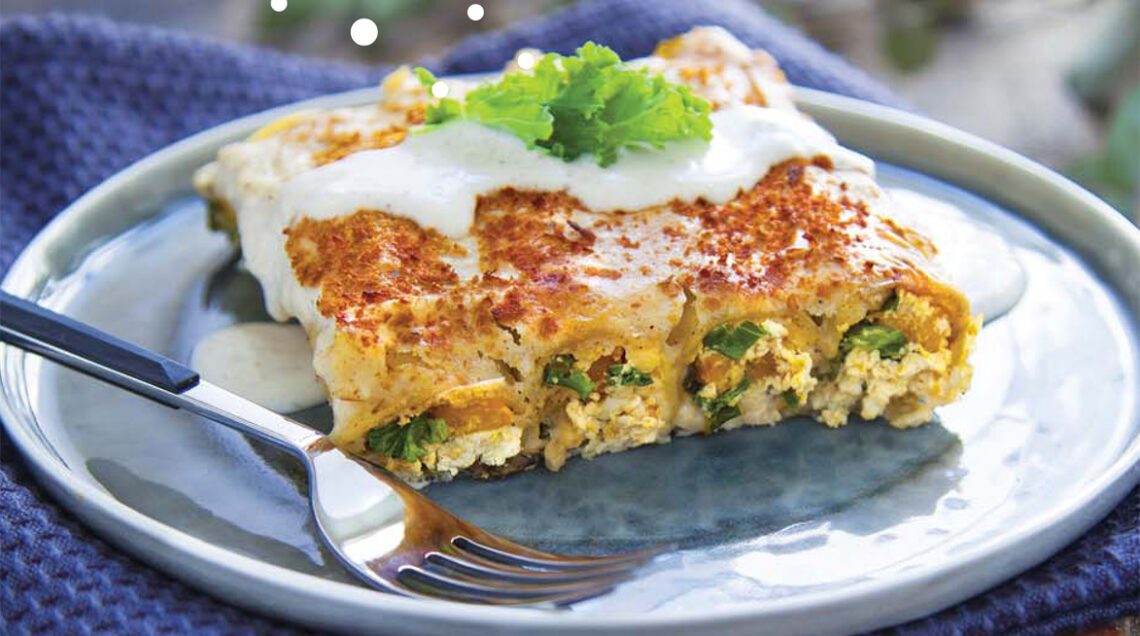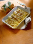 5) Versa un po' di besciamella sul piatto e disponi i cannelloni l'uno attaccato all'altro. Ricopri di besciamella e cospargi un po' di lievito alimentare. Cuoci nel forno caldo a 180°. Servi i cannelloni con un'insalatina per un pasto leggero.
