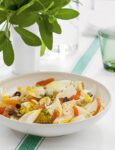 6) Prepara la besciamella sciogliendo la farina nell’olio di soia, unisci una grattata di noce moscata e, mescolando con cura, il rimanente latte di soia caldo.