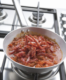A questo punto unite il salame piccante tagliato a striscioline, fate riprendere l'ebollizione, spegnete e regolate di sale.
