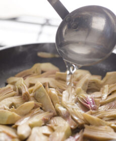 Private i carciofi del gambo, delle punte e delle foglie esterne dure. Arrotondate i fondi con un coltellino, tagliateli a metà, nel senso della lunghezza, eliminate il fieno interno e divideteli in spicchietti. Tuffateli, man mano, in acqua acidulata con il succo del limone per non farli annerire. Sciogliete nella padella 20 g di burro con un filo d'olio, unite i carciofi sgocciolati, regolate di sale e pepe e cuocete per 10-15 minuti, a fuoco medio, unendo poca acqua calda, se necessario.