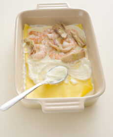 Imburrate la pirofila e versa sul fondo un velo di salsa. Fate uno strato di pasta, uno di besciamella, uno di gamberi e uno di carciofi. Spolverizzate con parte del parmigiano grattugiato e aggiungete 1/4 dei gamberi; poi cospargete con 1/4 delle le mandorle. Proseguite, alternando gli strati, fino a esaurire gli ingredienti. Trasferite la pirofila nel forno caldo a 180° per circa 40 minuti. Lasciate riposare le lasagne per qualche minuto prima di servirle.