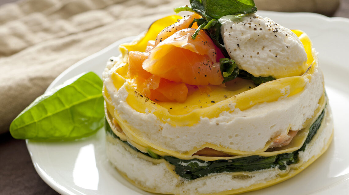 4) Appoggia il coppapasta con il quale hai tagliato la pasta su una placca foderata con carta da forno imburrata, sistema sul fondo un disco di pasta, quindi uno strato di ricotta, un altro disco di pasta, uno strato di spinaci, uno di pasta, uno di salmone poi ancora pasta e ricotta e infine termina con il quinto disco di pasta.