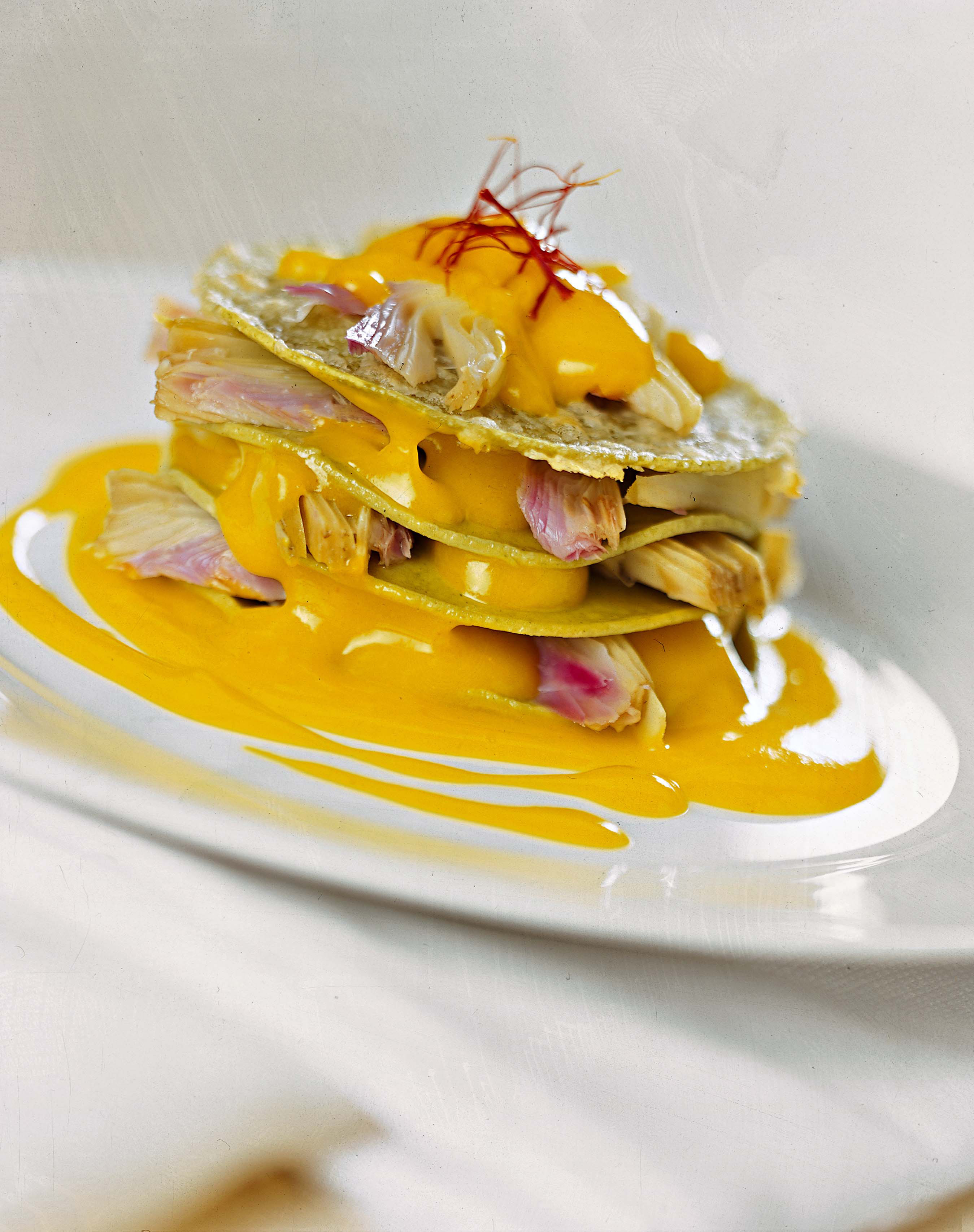 4) Lessa le lasagne in abbondante acqua salata. Scolale al dente e adagiale sul piano di lavoro, poi, con un tagliapasta, ricavane il maggior numero possibile di dischi. Alterna in una teglia dischi di lasagne, salsa allo zafferano e carciofi fino a esaurire gli ingredienti.