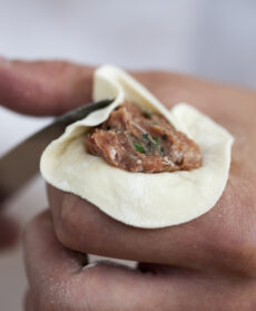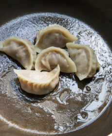 Piccole lune di sfoglia sottilissima fatta in casa racchiudono un ripieno di carne di maiale speziata allo zenzero. Cotti prima a vapore e poi alla piastra, sono un piatto gourmand