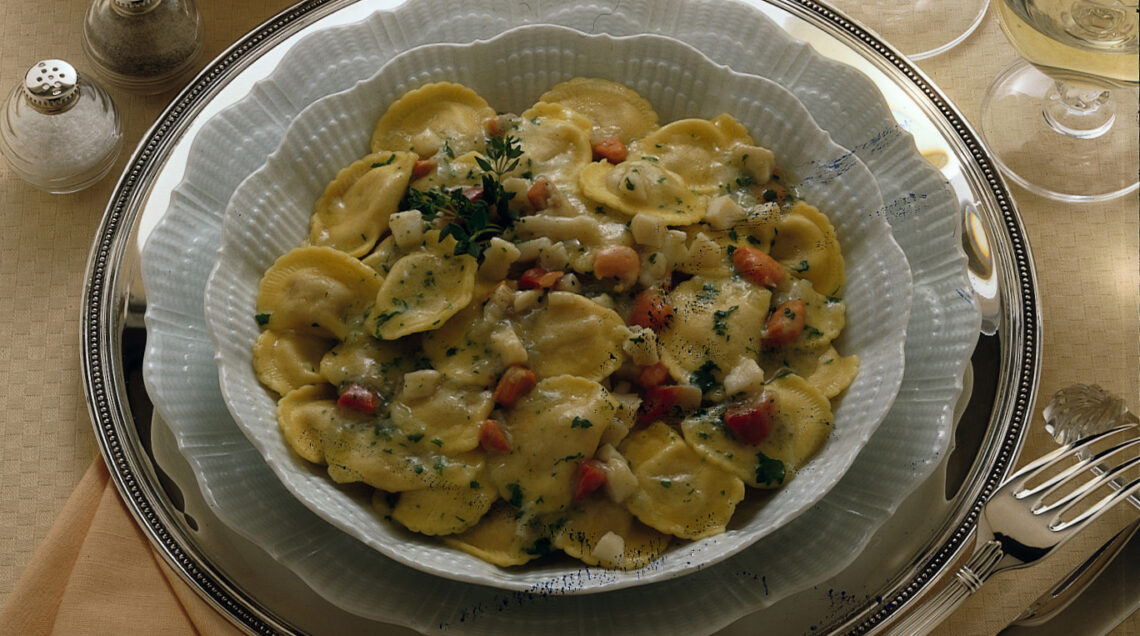 Questo piccolo capolavoro di pasta ripiena è cesellato nei minimi particolari offrendo un piatto raffinato, delicato, gusto e leggero. La sfoglia fresca all'uovo racchiude un ripieno di sogliola stufata con aglio, prezzemolo e timo e le mezzelune appena lessate sono condite con pregiati frutti di mare, le capesante, scalogni, burro e gherigli di noce. Più facile di quanto di pensi, questo primo è perfetto anche in caso di ospiti.
