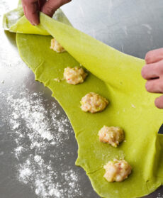 Riprendi la pasta, stendila e tagliala in rettangoli, quindi mettici il ripieno diviso in mucchietti, poi ricopri il composto con un’altra striscia di pasta.