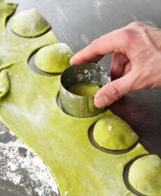 Chiudi ogni pansotto e taglialo a mezzaluna con un coppapasta, poi mettili sulla spianatoia distanziati tra di loro e lasciali asciugare.