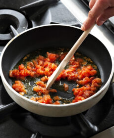 In una padella fai soffriggere 2 cucchiai di olio insieme all’aglio, aggiungi la polpa dei pomodori e aggiusta di sale e pepe. Cuoci per 2-3 minuti.