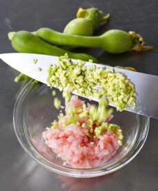 In una ciotola mescola gamberi, zucchine trombetta, panna e 2 tuorli, fino ad avere un composto denso, poi aggiusta di sale e pepe.