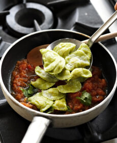 Cuoci i pansotti in abbondante acqua salata, scolali e saltali nel sugo, poi distribuiscili nei piatti.