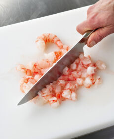 Nel corso di questa ora prepara il ripieno dei pansotti: pulisci e tritai gamberi, monda le zucchine e tagliale a dadi, poi cuoci entrambi al vapore per un minuto.