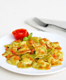Servi i pansotti di gamberi e zucchine al pomodoro profumati con il basilico.