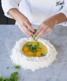 Raccogliete la farina sulla spianatoia, fate la fontana e sgusciate al centro le uova; unite un pizzico di sale, 1 cucchiaio di olio e le foglie di basilico spezzettate.
