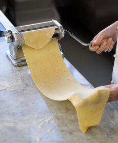 Riprendete la pasta e stendetela con il matterello o con i rulli dell'apposita macchina in lunghe sfoglie molto sottili.