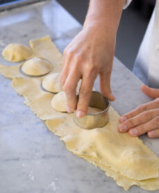 Bagnate una sfoglia con un pennello tuffato in acqua fredda, distribuitevi il ripieno a mucchietti distanti 4-5 cm. Coprite con un'altra striscia di pasta e incidete i ravioli con un coppapasta. Continuate così fino a esaurire pasta e ripieno.