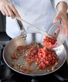 Per la salsa tritate la cipolla e tagliate i pomodori a cubetti. Fate soffriggere la cipolla in una padella con 3 cucchiai di olio, aggiungete i pomodori, salate e fate cuocere per 10 minuti.