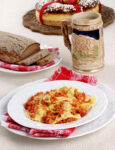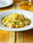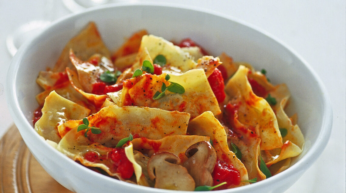 3) Stendi la pasta molto sottile, tagliala in strisce larghe 6 cm e disponici il ripieno a mucchietti, ripiegaci sopra la pasta, sigillala e ricava i ravioli. Cuoci in acqua salata per un minuto da quando vengono a galla, scolali con una schiumarola e condiscili con la salsa di pomodoro ben calda. Servi subito.