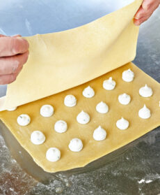 3) Riporta sui mucchietti di ripieno l'altra mezza sfoglia procedendo delicatamente per non scomporli. Premi leggermente uno stampino (dalla parte non tagliente) attorno a ogni mucchietto di ripieno, poi ritaglia i ravioli con uno stampino un po' più largo.