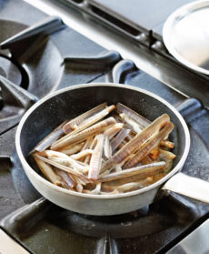 2) Salta in una padella i cannolicchi ben lavati con un cucchiaio di olio e l'aglio; appena si aprono, scolali, sgusciali, filtra il fondo di cottura e rimetti tutto nella padella.