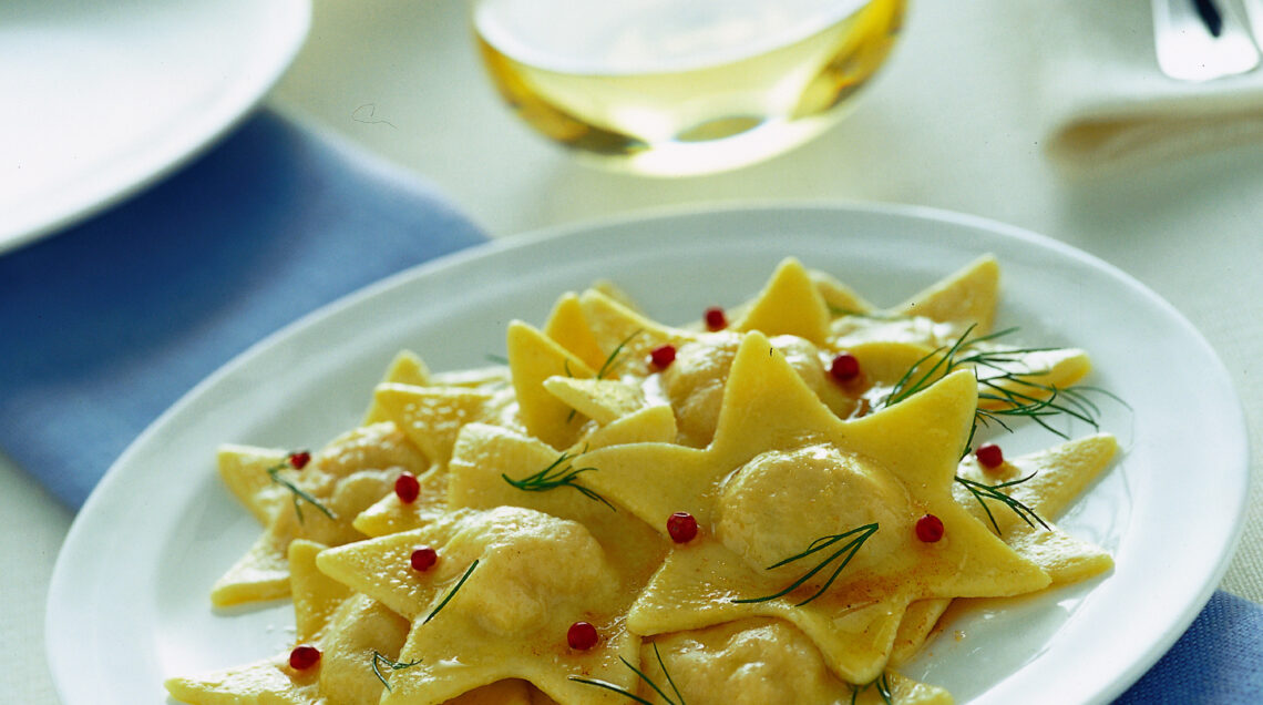 La forma a stella conferisce a questi ravioli l'ultimo tocco di charme per un primo piatto dedicato alla tavola della Festa. Pasta fresca fatta in casa con un morbido ripieno di salmone e il tocco profumato del pepe rosa e dell'aneto.