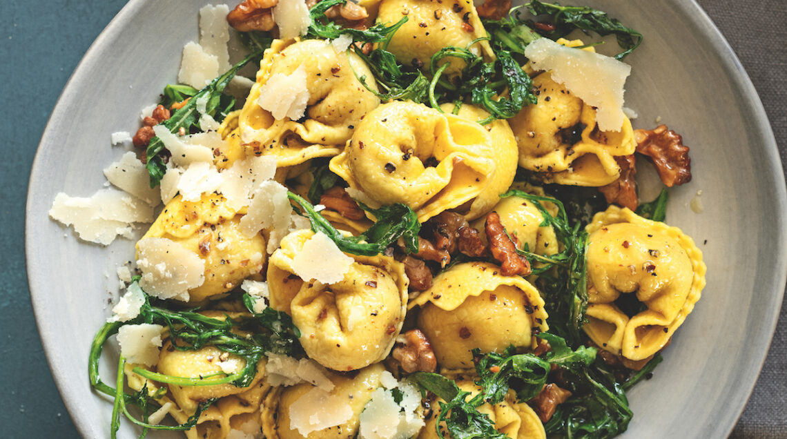 3 Versate i ravioli nell'acqua in ebollizione e cuoceteli per il tempo indicato sulla confezione. Sgocciolateli con un mestolo forato e trasferiteli direttamente nella padella con la rucola e i gherigli di noce.