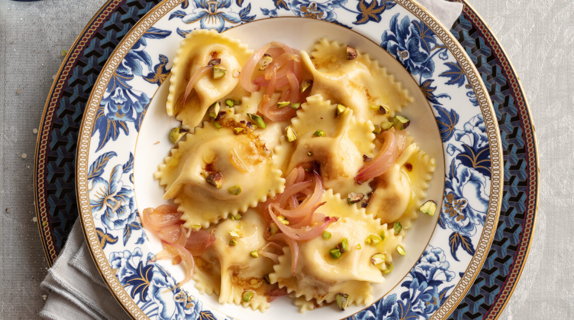 4 Lessate i ravioli in acqua salata bollente per 4-5 minuti, scolateli e conditeli con le cipolle caramellate, un filo d'olio e 1 cucchiaio di glassa al balsamico. Spolverizzate con i pistacchi tritati grossolanamente e servite con altra glassa a parte.