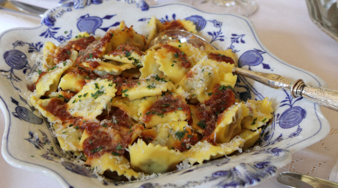 4 Lessate i ravioli, conditeli a strati con il sugo di cottura della carne stemperato con la ricotta, un po' di prezzemolo tritato e di grana. Aggiungete un filo d'olio e coprite i tortelli per 30 secondi prima di servire.