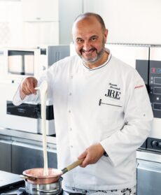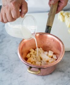 Fate la fonduta: tagliate a cubetti l'Asiago e lasciatelo sciogliere in un pentolino di rame a bagnomaria unendo 16 g di farina, 10 g di burro, 100 ml di latte e il sale. Mescolate il mix con un cucchiaio di legno effettuando un movimento rotatorio dal basso verso l'alto finché, sollevando il cucchiaio, la fonduta filerà a nastro senza stracciarsi. Spegnete, lasciate raffreddare e trasferite la preparazione in frigo o nell'abbattitore.