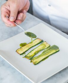 Fate la pasta lavorando 200 g di farina con 1 uovo e i 4 tuorli, unite un cucchiaio d'acqua, se necessario, per ottenere un impasto morbido ma asciutto. Quindi formate una palla, avvolgetela nella pellicola e lasciatela riposare al fresco per 20 minuti. Emulsionate l'aceto di mele con 80 ml d'olio, il prezzemolo e l'aglio tritati, alcune foglie di menta e un pizzico di sale. Lavate e spuntate le zucchine, ricavate 20 fette lunghe e sottili, conditele con sale e pepe e fatele rosolare in una padella con qualche cucchiaio d'olio per 3 minuti girandole a metà tempo. Trasferitele in un piatto, irroratele con l'emulsione e lasciatele marinare per 30 minuti.