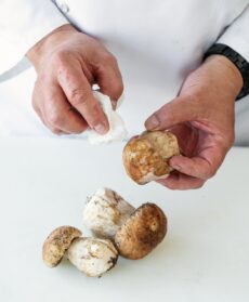 Pulite i porcini, tagliateli a cubotti e saltateli in padella con poco olio d'oliva.