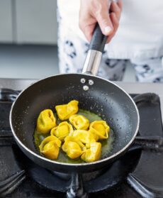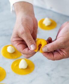 Stendete la pasta con la macchinetta in modo da renderla il più sottile possibile. Coppatela in dischi di 10 cm. Lavorate la fonduta con le mani, formate tanti salamini e diviteleli in porzioni grandi come una noce. Mettete al centro di ogni disco una noce di ripieno, piegate la pasta a metà e avvicinate le due punte, formando i tortelli intorno al dito indice.