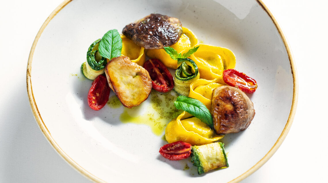 Lessate i tortelli in acqua bollente salata per 4 minuti, scolateli e fateli saltare per un minuto in padella con la marinata delle zucchine. Formate dei rotolini con le zucchine. Distribuite nei piatti tortelli, rotolini di zucchine, cubotti di porcini, mezzi pomodorini, completate con 1 cucchiaio di marinata e foglioline di menta; servite.