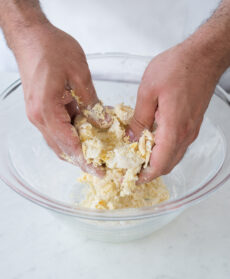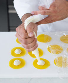 5) Fai scendere al centro di ogni dischetto un ciuffo di mascarpone. Richiudi la pasta sul ripieno in modo da ottenere una mezzaluna.