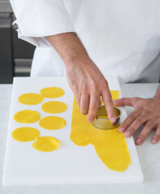 3) Con un coppapasta rotondo ritaglia le sfoglie in dischetti di 4-5 cm, inumidiscili con acqua fredda e coprili con pellicola per non farli seccare.