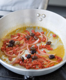 7) In una padella rosola con un filo di olio i pomodorini tagliati a metà, quindi unisci la cipolla tagliata a losanghe e le olive. Bagna con poca acqua, sala e cuoci per alcuni minuti.