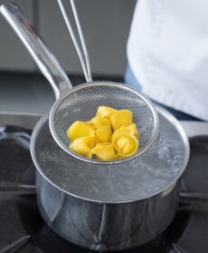 8) Cuoci i tortelli in abbondante acqua bollente salata per 4-5 minuti; scolali con una schiumarola.