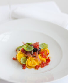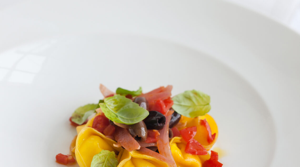 Tortelli di mascarpone con pomodorini, cipolla rossa e olive