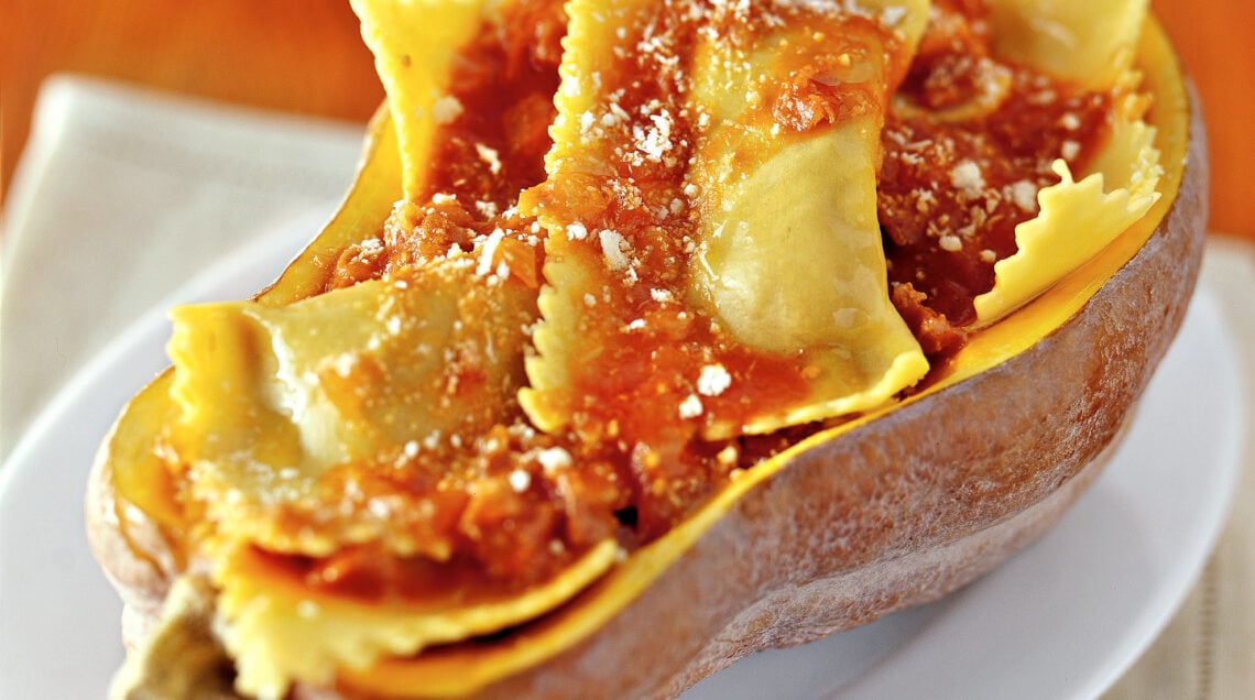 Pasta fresca fatta in casa, ripiena di zucca, mostarda e amaretti. Perfetto il condimento di pomodoro, in armonia con la dolcezza sapida del ripieno