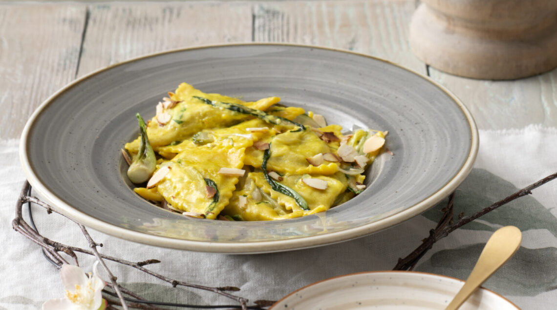 Tostate per 2 minuti le mandorle a filetti. Frullate le mandorle sgusciate con il latte di mandorla e filtratelo. In un padellino, tostate leggermente lo zafferano e unite il latte di mandorle. Lavate le puntarelle, affettatele, saltatele in padella con un filo d'olio e l'aglio rimasto sbucciato, salatele e fatele appassire. Cuocete i ravioli, ripassateli in padella con il condimento, unite le puntarelle, le mandorle tostate e servite.