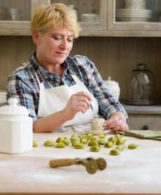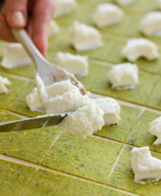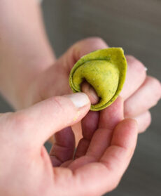 Ripeti l’operazione con tutti i quadrati. Disponi i tortelloni sulla spianatoia infarinata o su vassoi foderati di carta da forno, senza sovrapporli per non farli attaccare.